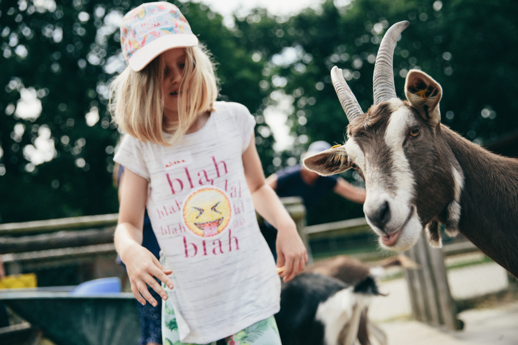 Bei uns leben vier Ziegen: Hansi, unser Ziegen-Opa, ist ein bunter Ziegenmix, und unsere drei jungen Damen Milly, Anna und Krümel sind drei junge Thüringer Waldziegen, die freudig unsere jungen Farmbesucher*innen begrüßen. In den Sommermonaten kann man die drei auch beim Spazierengehen auf der Farm entdecken.